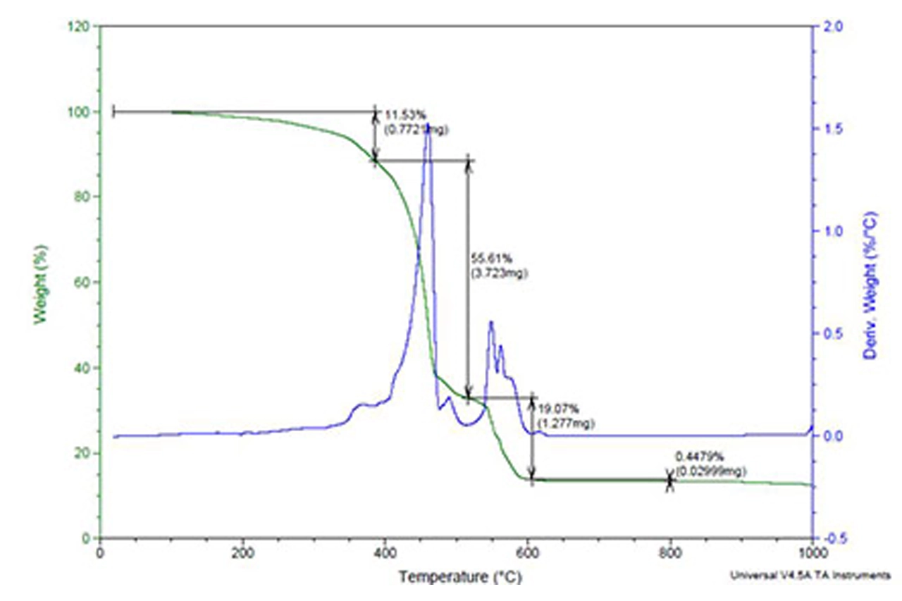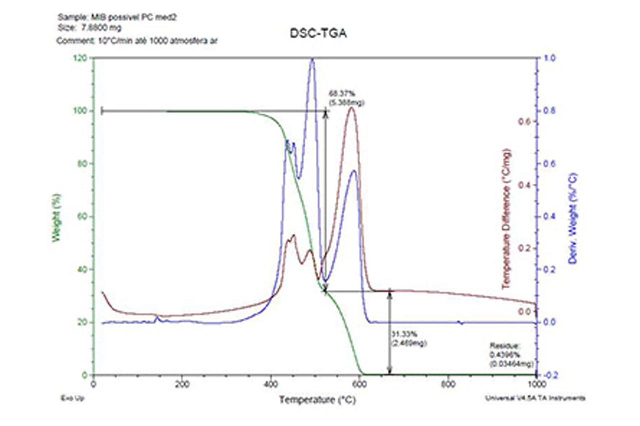 A técnica de Termogravimetria avalia a perda de massa do material durante um aquecimento controlado. Deste modo, permite avaliar a quantidade de volátil, combustível e teor de cinzas do material. O teste pode ser realizado em ambiente oxidativo ou inerte e fornece informações quanto à composição e estabilidade térmica do material.